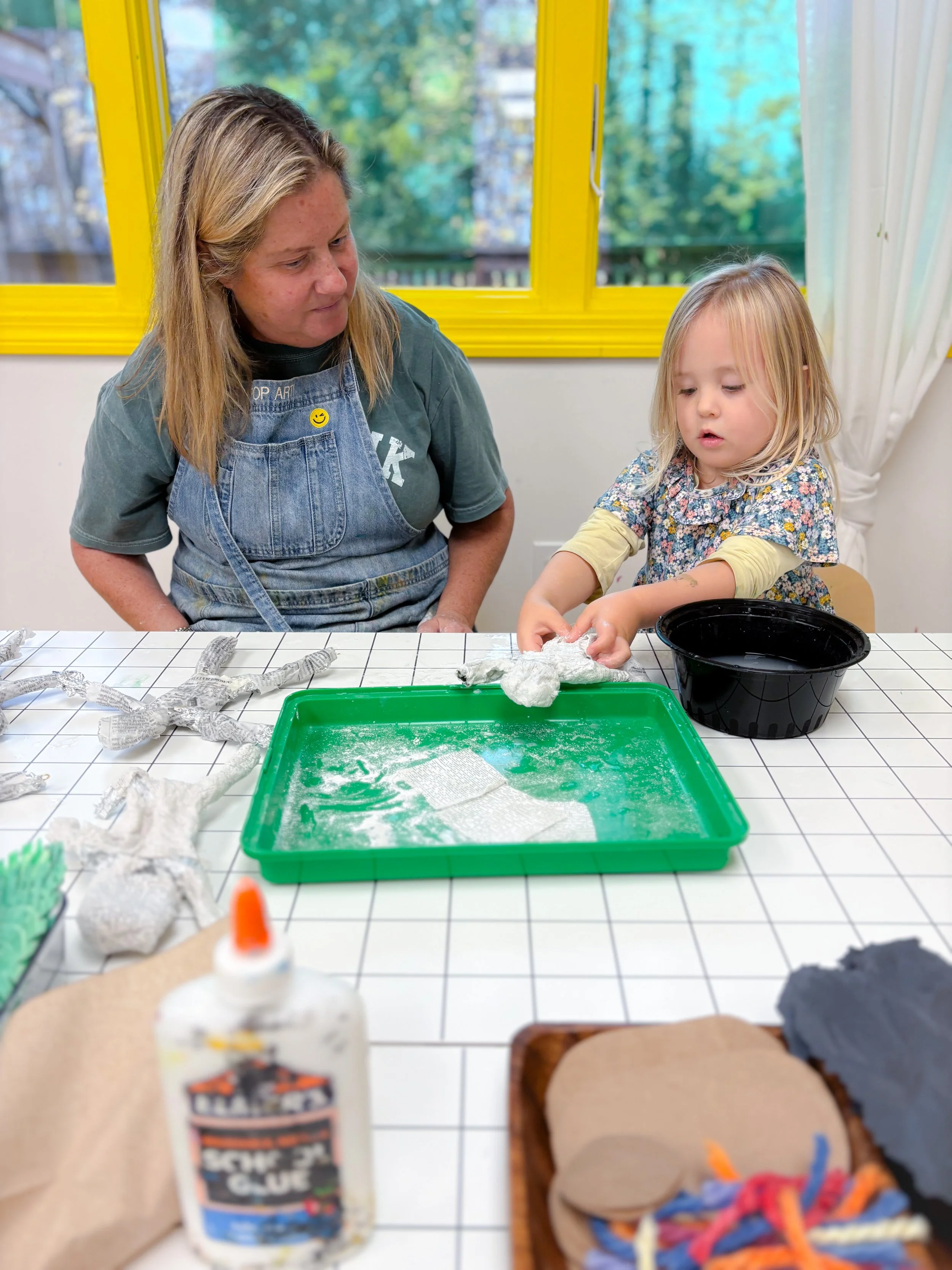 We hire and train team members to become PopArt! Certified. Our certification training covers our unique sensory-rich approach, Reggio Emilia principles, child development, and how to create meaningful learning experiences through messy play. If you and your child have attended a session before and you're interested in working with us, reach out to Rosie at rosie@popart.kids. We love when families who understand our philosophy join our team!