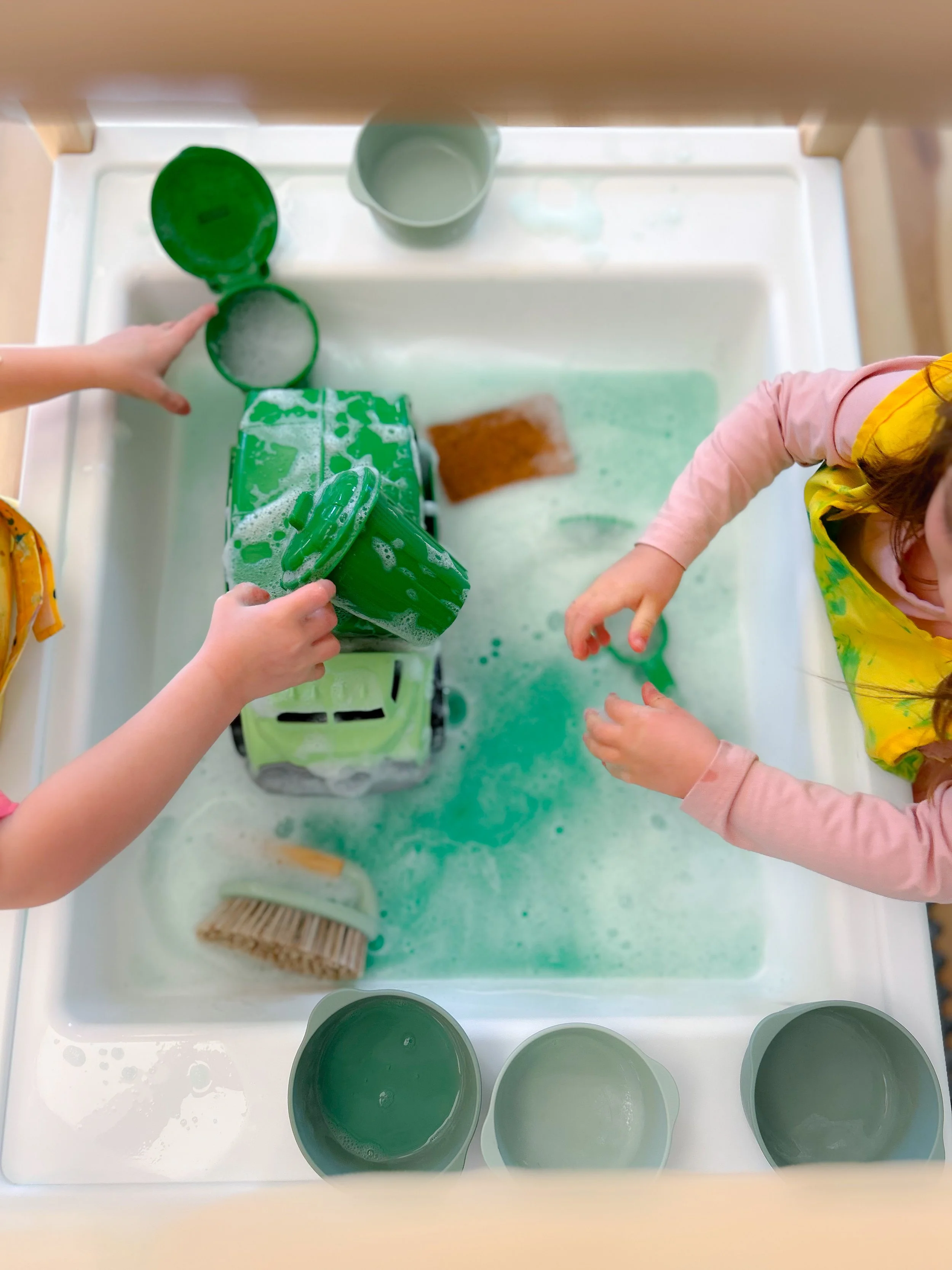Why it works: Kids love "helping" and taking care of their toys. Set up a car wash station where they can scrub their trucks, rinse them off, and dry them. The soapy water adds a new texture, and the repetitive scrubbing is incredibly satisfying for little hands. Plus, you end up with clean toys!